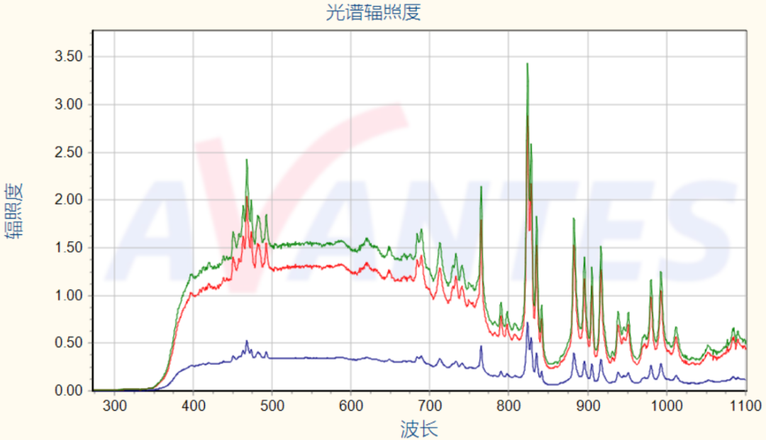 基于AvaSolar分光輻射儀特有的快速采集功能,也可應(yīng)用在瞬態(tài)模擬器的光譜檢測中。AvaSolar可實(shí)現(xiàn)每秒鐘450幅光譜的采集,不管模擬器的工作模式是單次脈沖、多次頻閃,無論脈沖弛豫時(shí)間是小到2ms,還是較長的6s,AvaSolar設(shè)備均可得到真實(shí)可靠的輻照度數(shù)據(jù)。 以20 ms脈沖弛豫時(shí)間的氙燈為例,圖2顯示了在一個(gè)脈沖周期內(nèi),不同時(shí)間點(diǎn)的絕對輻射能量光譜。在脈沖氙燈工作的同時(shí),由太陽能模擬器系統(tǒng)給光譜儀一個(gè)TTL信號,觸發(fā)光譜儀開始工作。通過綠、紅、藍(lán)這三個(gè)順序測量得到的光譜圖比較可知,脈沖氙燈的能量輸出在逐漸的減弱。