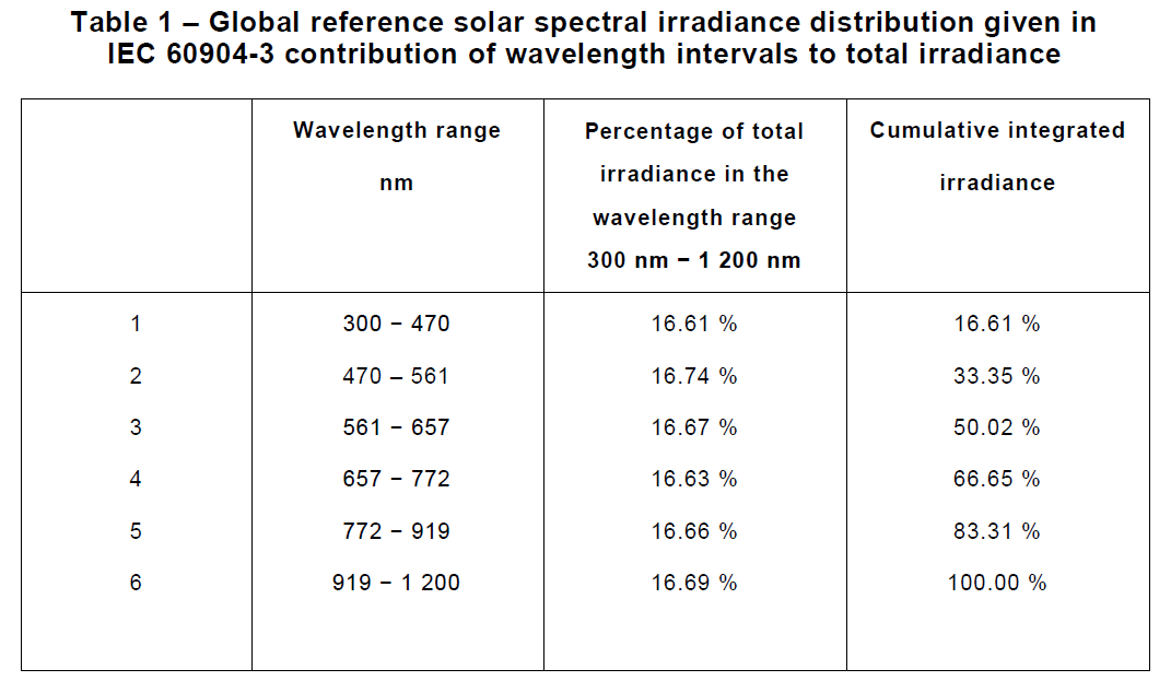 太陽模擬器的光譜匹配度是指在6個(gè)指定光譜范圍內(nèi)強(qiáng)度積分的百分比(見列表)。任何與標(biāo)準(zhǔn)光譜的偏離百分比都必須在一定的范圍內(nèi),這也正是衡量太陽模擬器等級的一項(xiàng)標(biāo)準(zhǔn)。對于A類太陽模擬器,光譜匹配度必須在75%~125%之間。