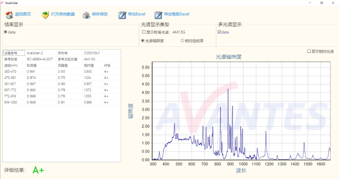 AvaSolar軟件可按照IEC60904標(biāo)準(zhǔn)上所述要求,根據(jù)測試得到的模擬器輻照度光譜數(shù)據(jù)直接給出模擬器的等級,可給出不同波段范圍內(nèi)的匹配度,以幫助用戶更好的判斷模擬器的性能。